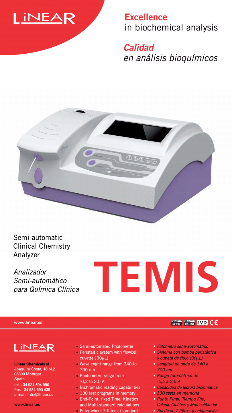 TEMIS - Excellence in biochemical analysis. Semi-automatic Clinical Chemistry Analyzer